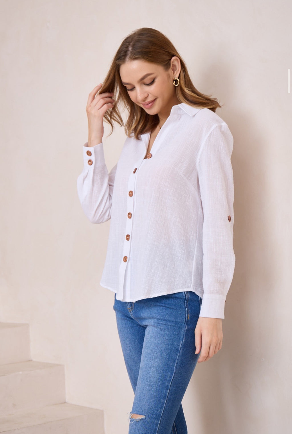 Elevate your casual style with the "Boston Shirt" in classic white, a versatile wardrobe essential from Blush Warragul's collection.