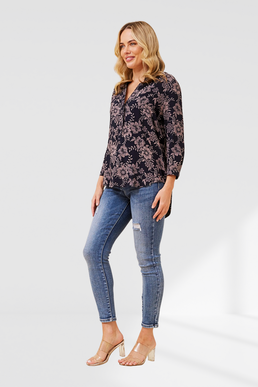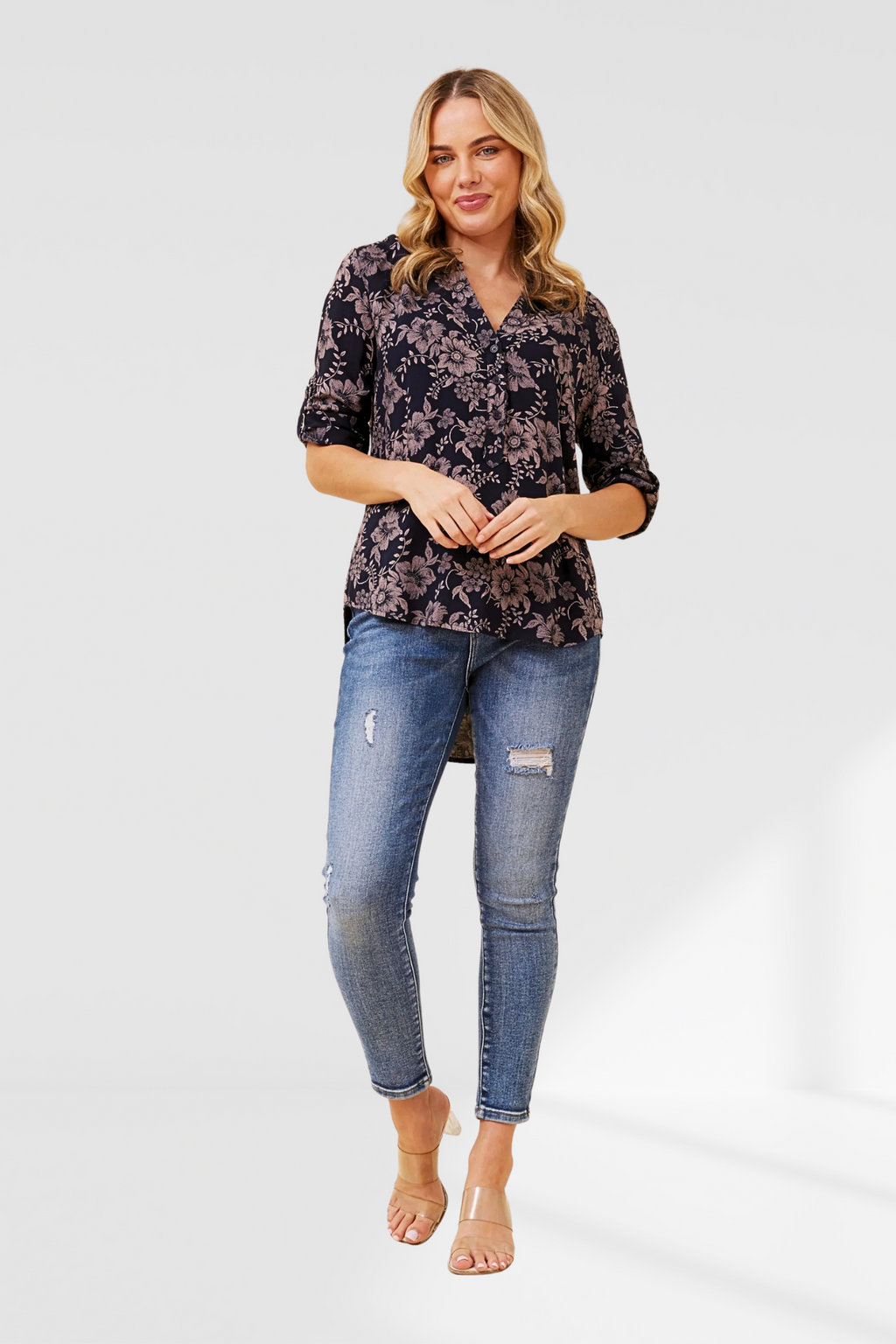 Elevate your everyday style with the Layla Shirt – a charming navy floral printed top that blends comfort with timeless appeal. Featuring a mandarin collar, 3/4 sleeves, relaxed fit, it’s perfect for workdays or weekends. Pair it with tailored pants or denim for a polished, effortless look.