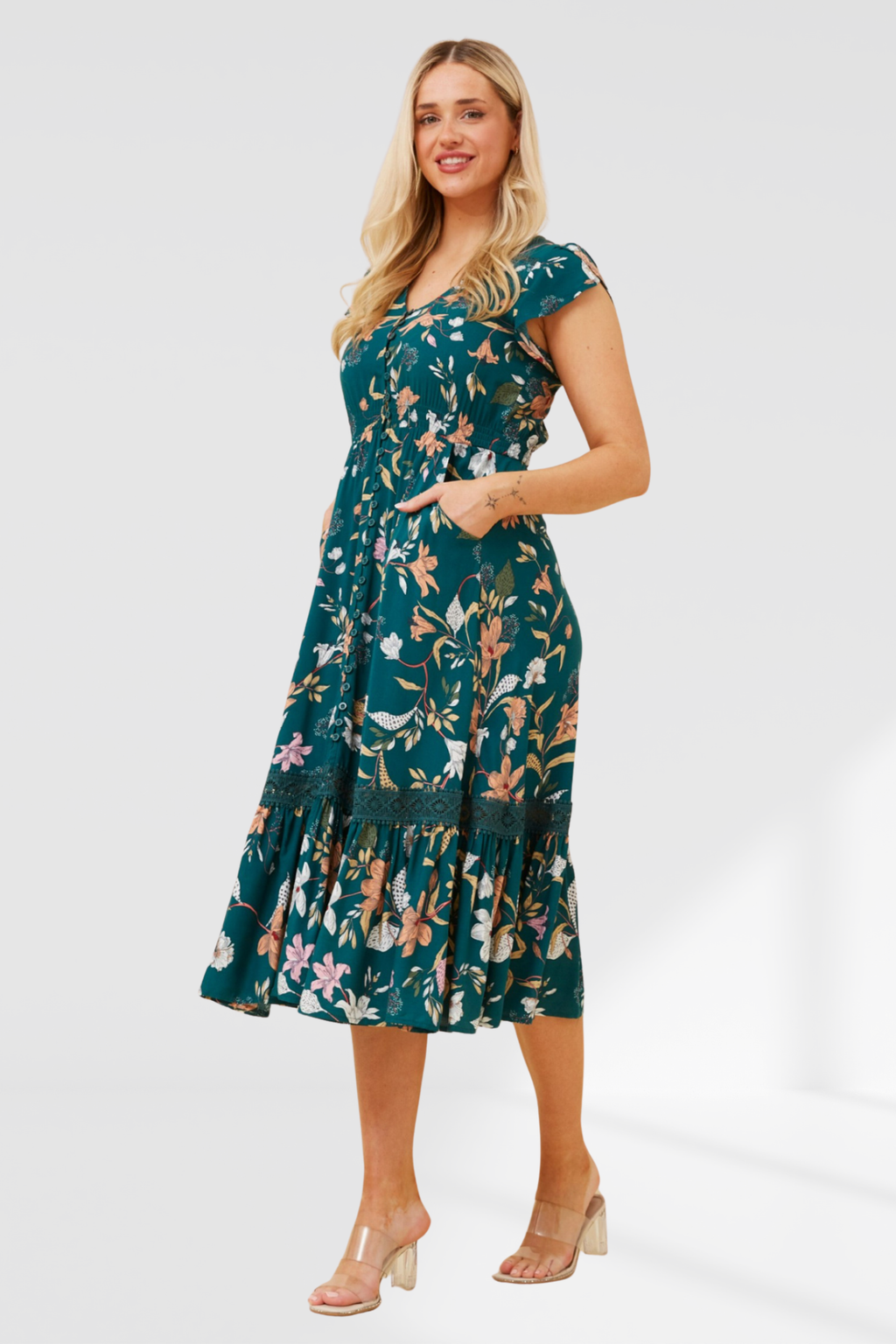 A dreamy holiday favourite, the Maggie Midi Dress combines effortless style with feminine charm. Featuring a floral print, lace accents and a flattering shirred waist, it’s perfect for long lunches or sunset strolls. Pair with heels or sandals for an easy, timeless look.