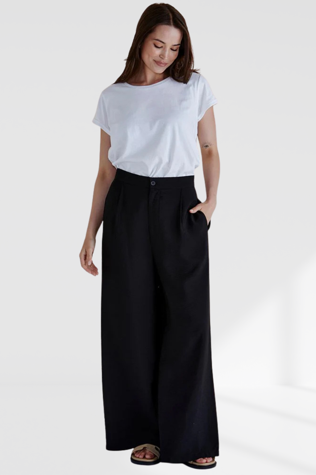 The Zander Pant combines a relaxed fit with a cropped length and elasticated waistband with button detail. Its refined crinkle feel and pockets make it a sophisticated yet comfortable choice for polished styling.